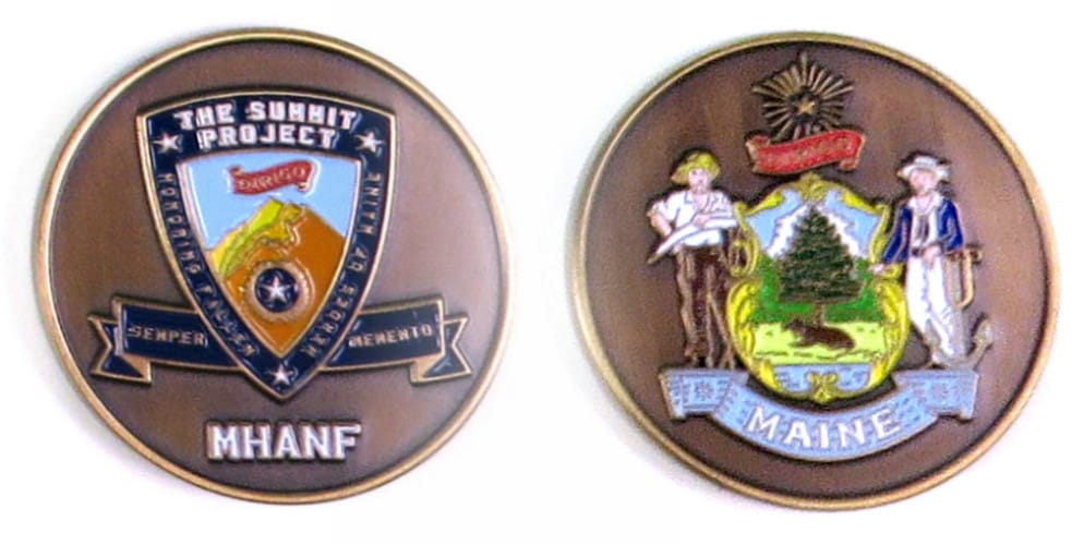 Round shaped coin, brass in color, 1 1/2 inches in diameter. Journal - Page 116 - Line 27 The Summit Project, a nationally recognized, Maine based, 501(c)3 service organization, is a living memorial that pays tribute to the fallen service membe... Read More