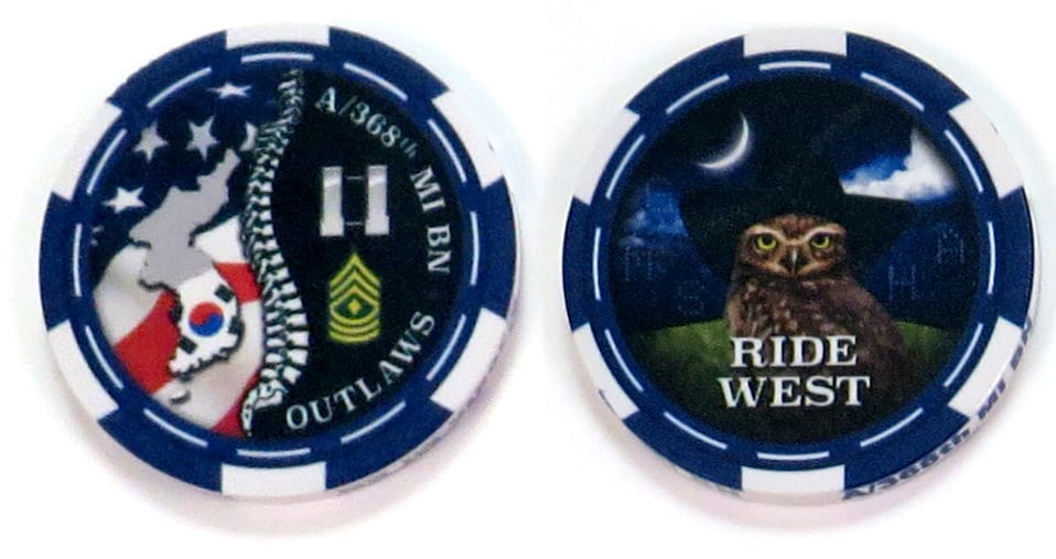 Round shaped poker chip, blue & white in color, 1 5/8 inches in diameter. Journal - Page 117 - Line 33 Read More