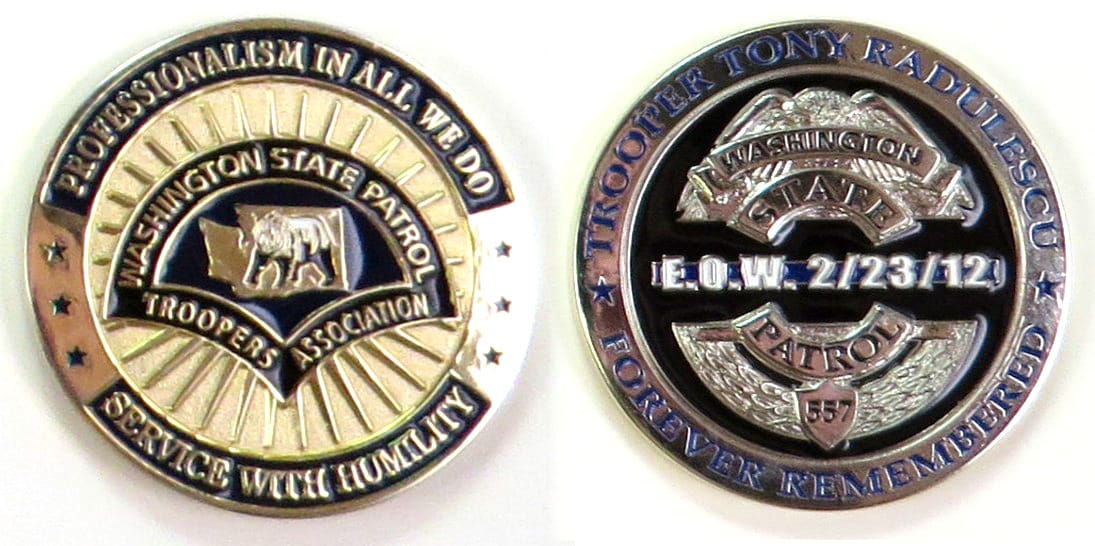 Round shaped coin, pewter in color, 1 3/4 inches in diameter. Journal - Page 120 - Line 14 The coin was ordered by the Washington State Patrol Troopers Association in remembrance of Trooper Tony Vian Radulescu, who was shot and killed on 23 Febru... Read More