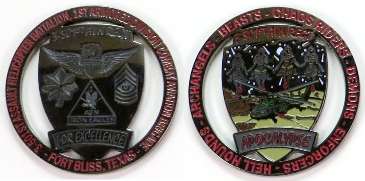 Round shaped coin, pewter in color, 2 1/4 inches in diameter. From the El Paso Times dated 8 May 2016, datelined Fort Bliss, Texas: "Soldiers from Fort Bliss' air assault helicopter battalion have been busy training since December for their next... Read More