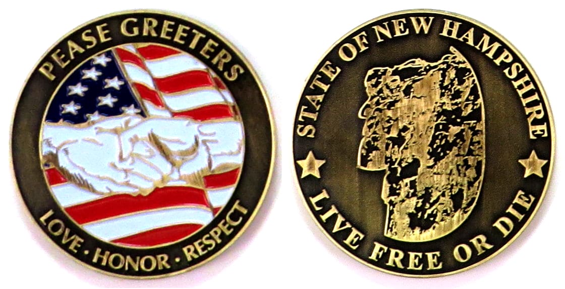 Round shaped coin, brass in color, 2 inches in diameter. Journal - Page 119 - Line 21 The Pease Greeters at Portsmouth International Airport is a nonprofit civilian organization which has met and greeted US Troops that transit through the former... Read More