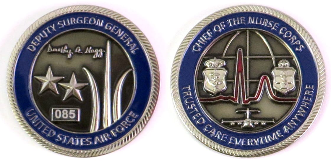 Round shaped coin, pewter in color, 2 inches in diameter. Journal - Page 117 - Line 29 Coin Number 085 Maj Gen Dorothy Hogg is USAF Deputy Surgeon General and Chief of the Nurse Corps. Read More