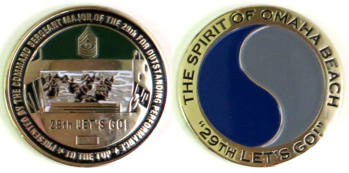 Round shaped coin, brass in color, 2 inches in diameter. Journal - Page 121 - Line 25 Coin Number 101 The 29th Infantry Division (29th I.D.), also known as the "Blue and Gray", is an infantry division of the United States Army based in Fort... Read More