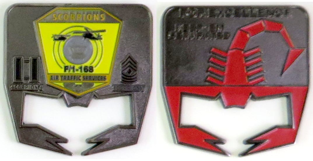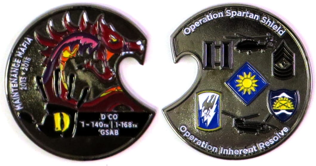Round shaped coin, brass in color, 2 inches in diameter. Journal - Page 121 - Line 5 B Company, 1st Battalion, 140th Aviation Regiment is known as the "Warhawks." Read More