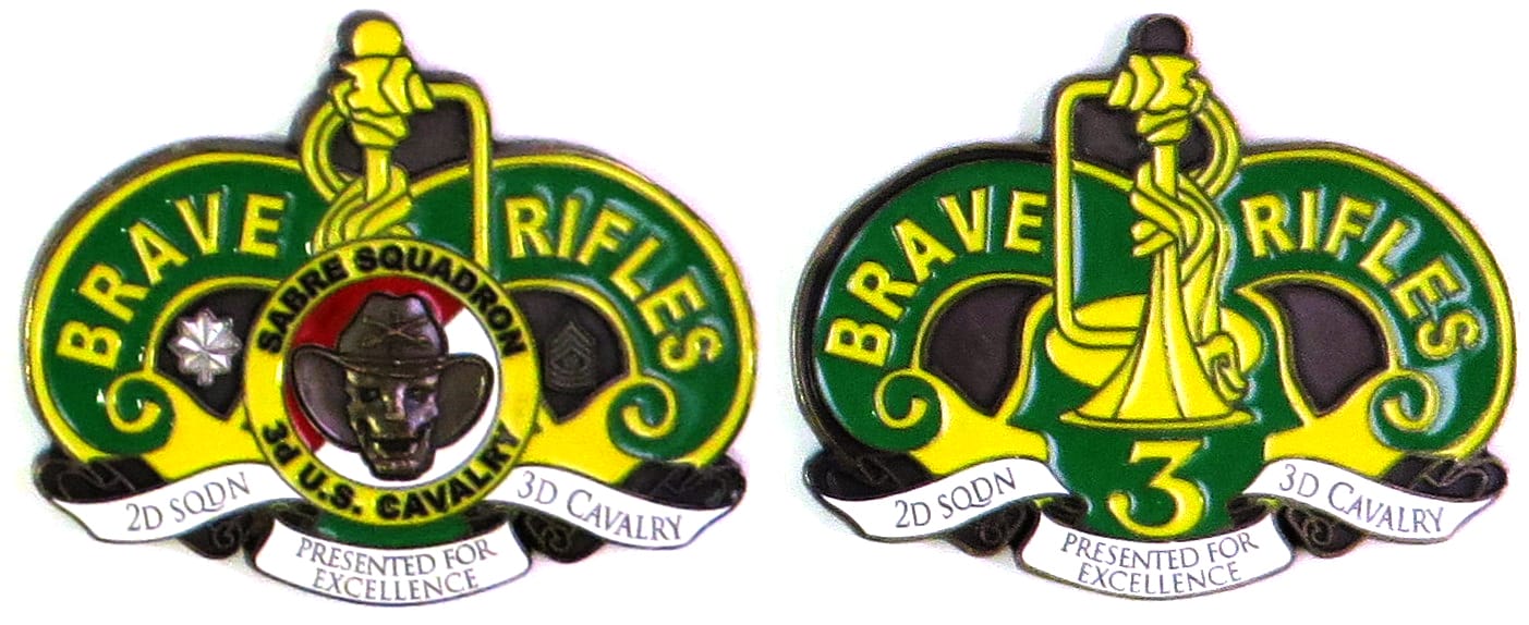 Gun metal black in color, 2 inches high x 2 1/2 inches wide. Journal - Page 121 - Line 15 2nd Squadron, 3rd Cavalry Regiment is known as the *Sabre Squadron." Read More
