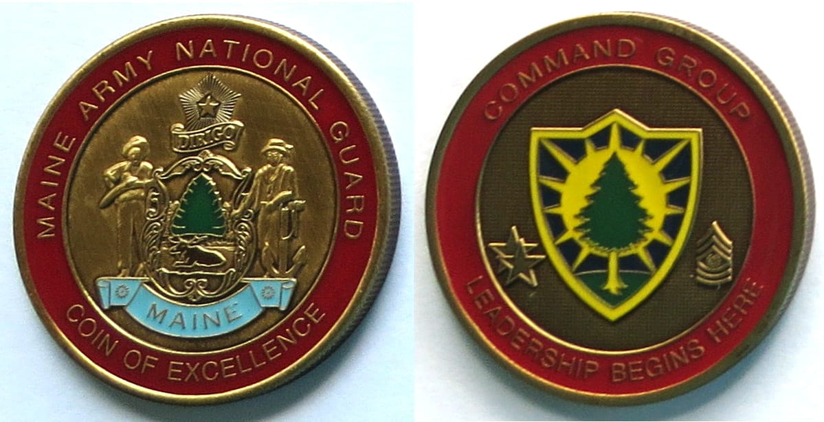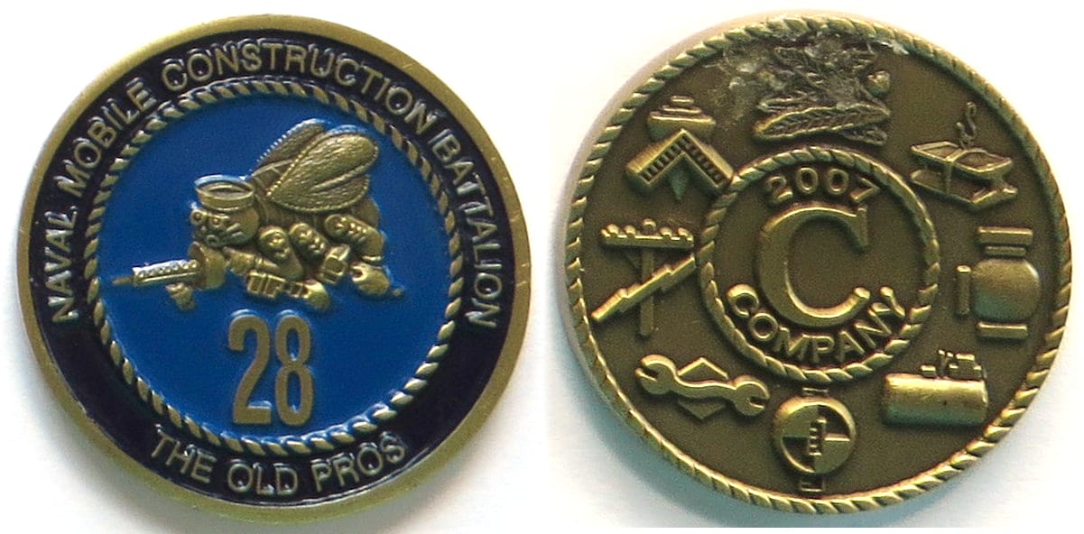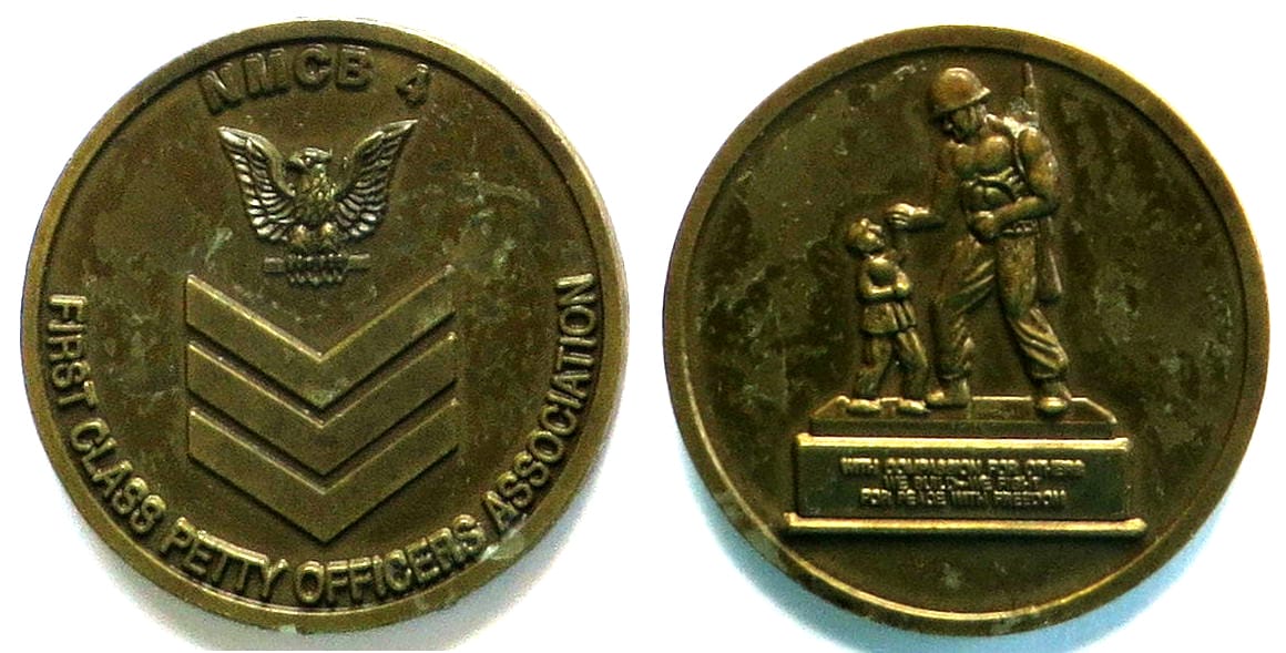 Round shaped coin, antique brass in color, 1 1/2 inches in diameter. The coin was struck for the NMCB-4 First Class Petty Officers Association. Naval Mobile Construction Battalion FOUR (NMCB 4) is a Navy Seabee battalion based out of Port Hueneme... Read More