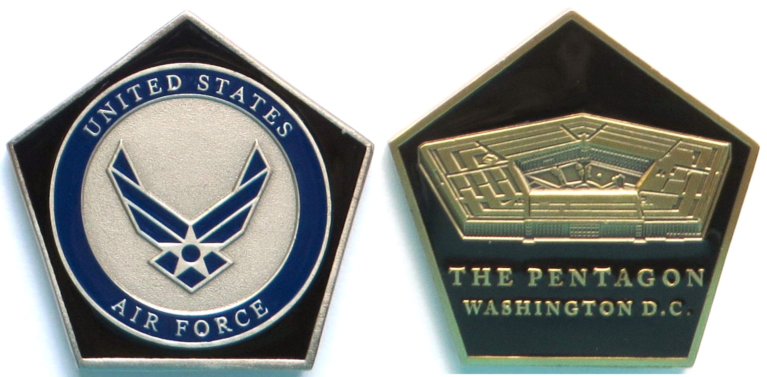 Pentagon shaped coin, pewter in color, 2 inches high x 2 inches wide. Journal - Page 118 - Line 30 Read More