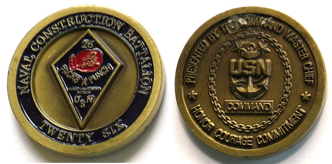 Round shaped coin, old brass in color, 1 1/2 inches in diameter. On 30 September 2014, following a ceremony held on 20 September, NMCB 26 was officially decommissioned at Selfridge Air National Guard Base, Michigan, leaving behind a long legacy of s... Read More