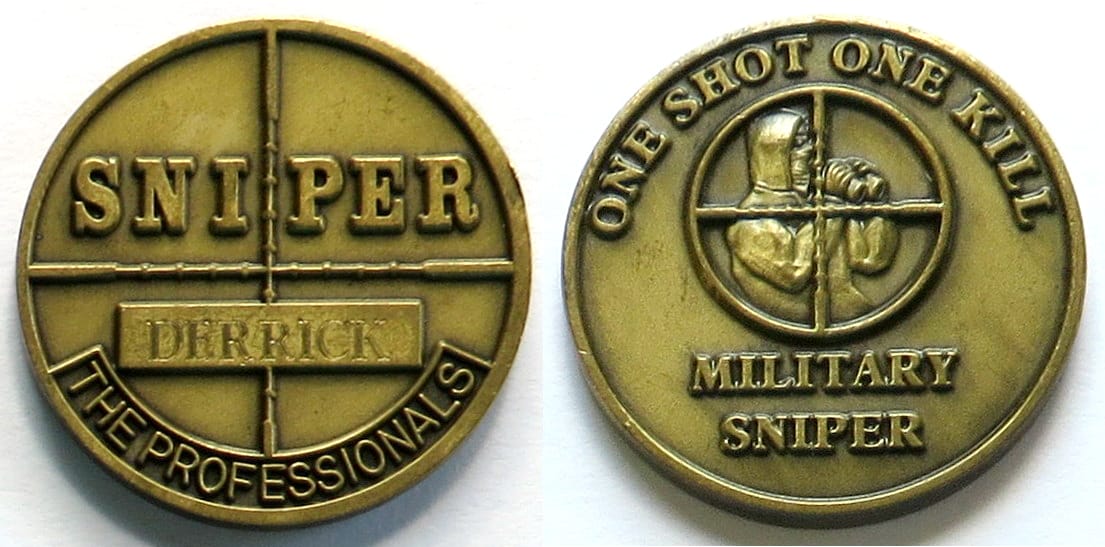 Round shaped coin, antique brass in color, 1 1/2 inches in diameter. The coin is engraved with the name of the recipient, "DERRICK." A sniper is a marksman or qualified specialist who operates alone, in a pair, or with a sniper team to maintain clos... Read More