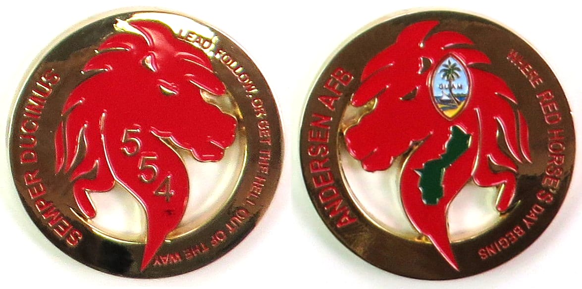 Round shaped coin, brass in color, 2 inches in diameter. Journal - Page 122 - Line 28 The 554th RED HORSE Squadron continues to uphold its unit motto, "semper ducimus" or "always leading" as it celebrated its 51st birthday on Oct.12 2016, making... Read More