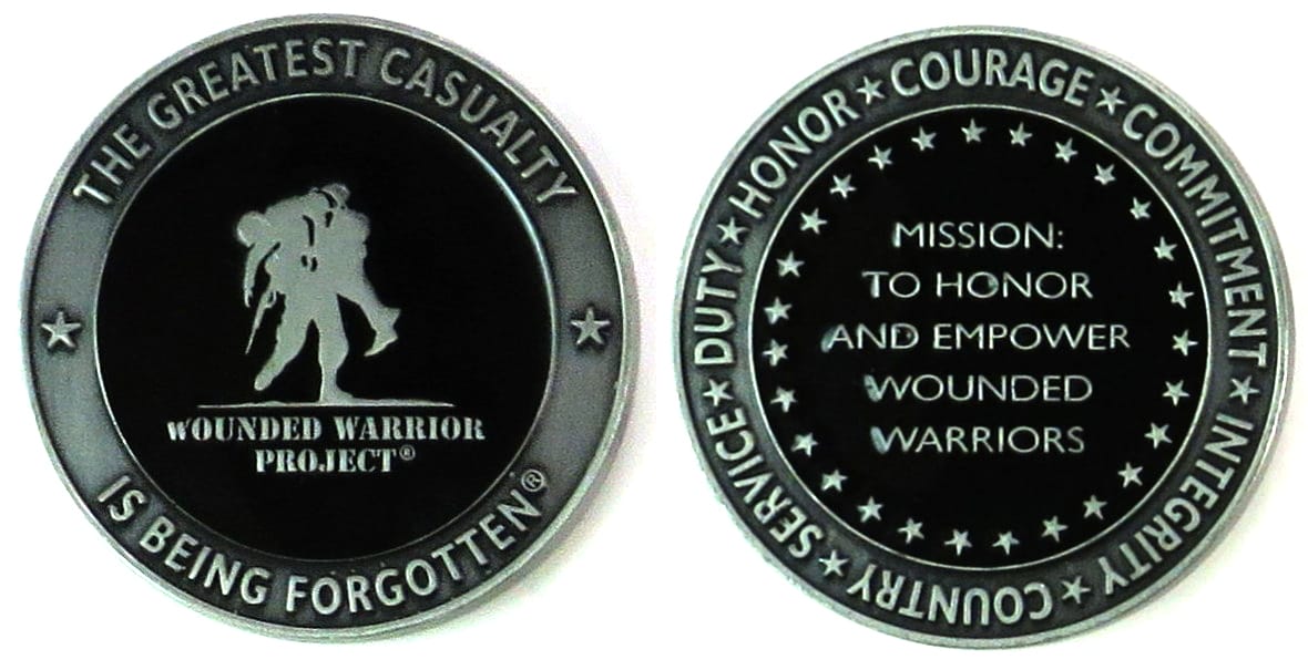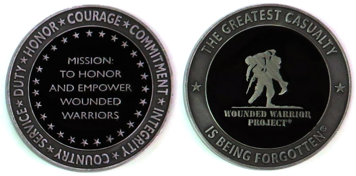 Round shaped coin, pewter in color, 2 inches in diameter. Journal - Page 121 - Line 28 Wounded Warrior Project (WWP) is a charity and veterans service organization that offers a variety of programs, services and events for wounded veterans of the... Read More