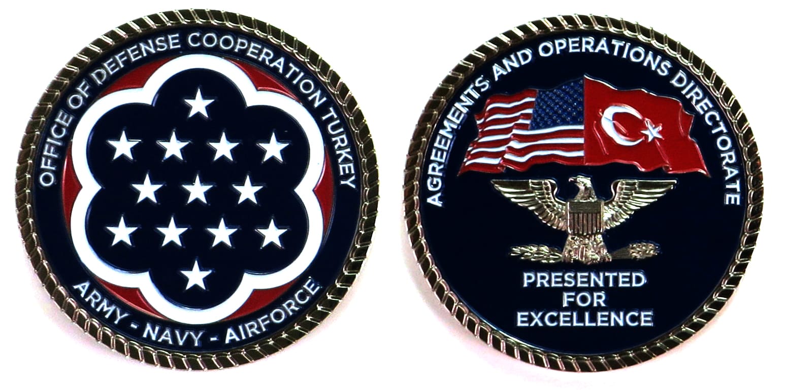 Round shaped coin, pewter in color, 2 1/2 inches in diameter. Journal - Page 123 - Line 5 The Office of Defense Cooperation, Turkey (ODC-T), was established in 1947 as the Joint American Military Mission for Aid to Turkey. It became the ODC-T in... Read More