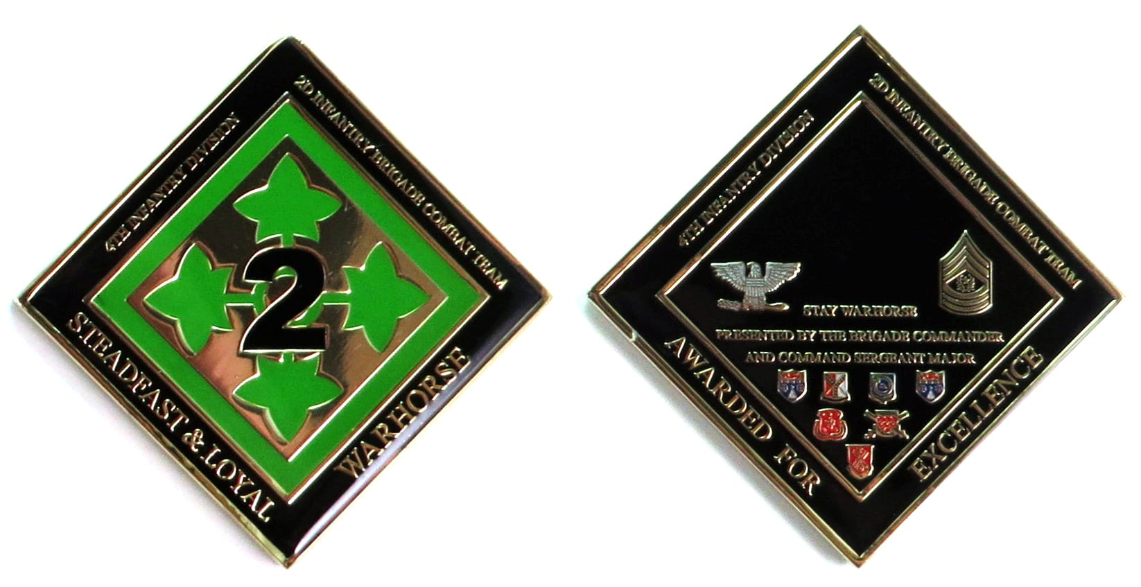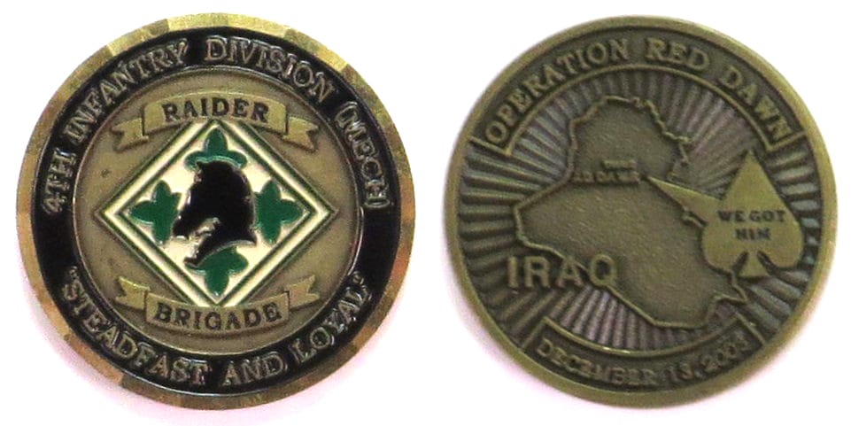 Round shaped coin, old brass in color, 1 1/2 inches in diameter. The coin was struck to celebrate the 4th Infantry's 1st Brigade participation in Operation Red Dawn. Operation Red Dawn was an American military operation conducted on 13 December 20... Read More