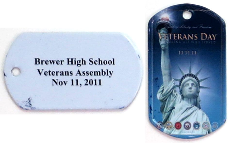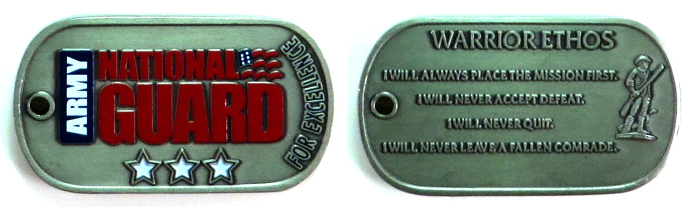 Dog tag shaped coin, pewter in color, 1 1/4 inches high x 2 3/8 inches wide. Journal - Page 123 - Line 12 The inscription on the back of the coin reads: "WARRIOR ETHOS I will always place the mission first. I will never accept defea... Read More