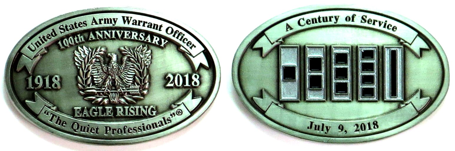 Oval shaped coin, pewter in color, 1 3/4 inches in diameter x 2 5/8 inches wide. Journal - Page 123 - Line 2 The coin anticipates the 100th anniversary of the US Army Warrant Officer, 9 July 1918 - 9 July 2018. CW4 Cardozo is with Headquarters an... Read More