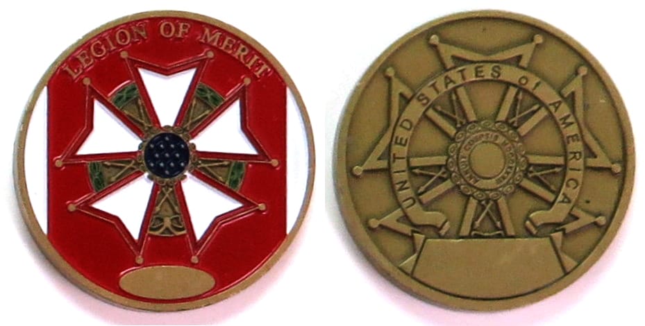 Round shaped coin, brass in color, 1 1/2 inches in diameter. Journal - Page 123 - Line 11 The Legion of Merit (LOM) is a military award of the United States Armed Forces that is given for exceptionally meritorious conduct in the performance of ou... Read More