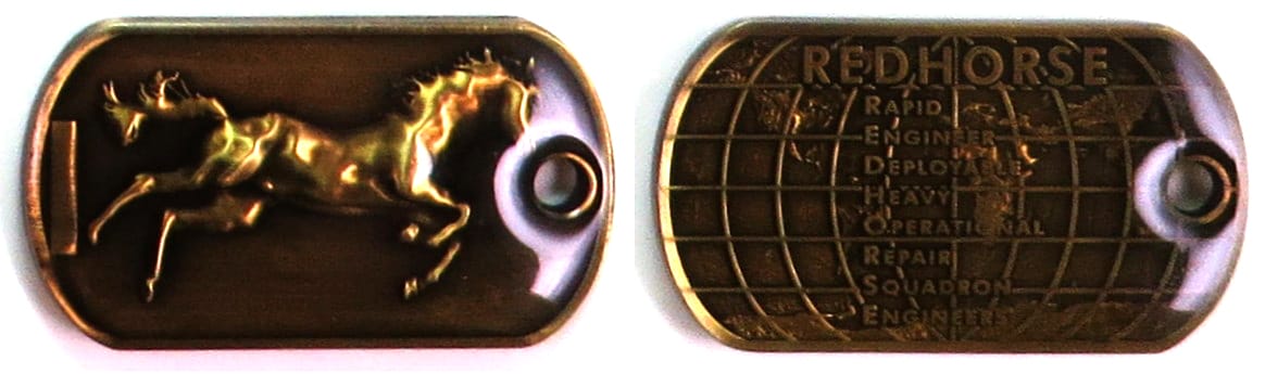 Dog tag shaped coin, antique brass in color, 1 1/8 inches high x 2 inches wide. Journal - Page 122 - Line 29 The term, RED HORSE, is a term used by the US Air Force to refer to their civil engineer units. The term means: Rapid Engineer... Read More