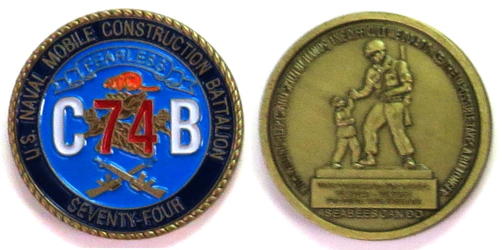 Round shaped coin, old brass in color, 1 1/2 inches in diameter. NMCB-74 has been selected "Best of Type" among the Atlantic Fleet battalions nine times during its history. It was awarded this honor under CDR Gordon W. Schley for fiscal year 1968, C... Read More