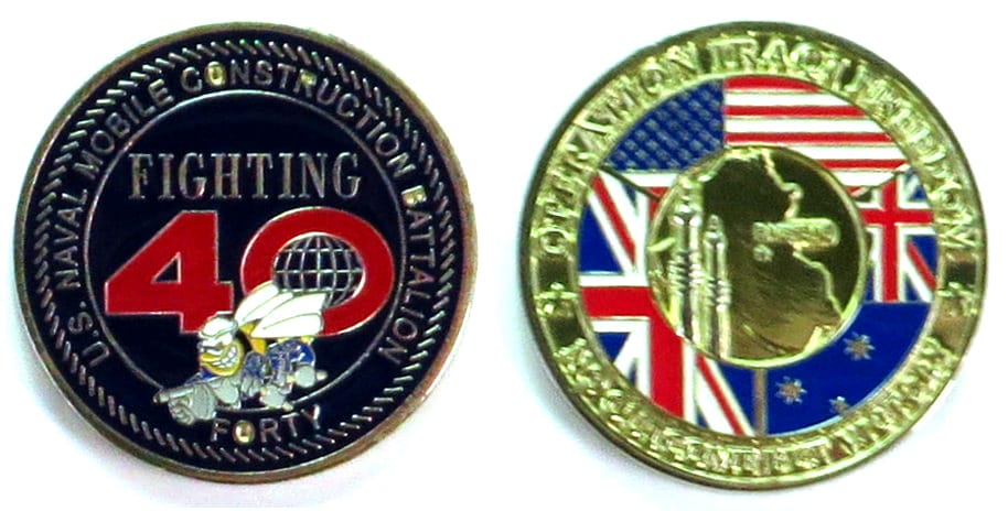 Round shaped coin, brass in color, 1 1/2 inches in diameter. Naval Mobile Construction Battalion 40 (NMCB 40) was a Navy Seabee Battalion based out of Port Hueneme, California. Nicknamed "Fighting FORTY". Its primary mission is wartime contingency... Read More