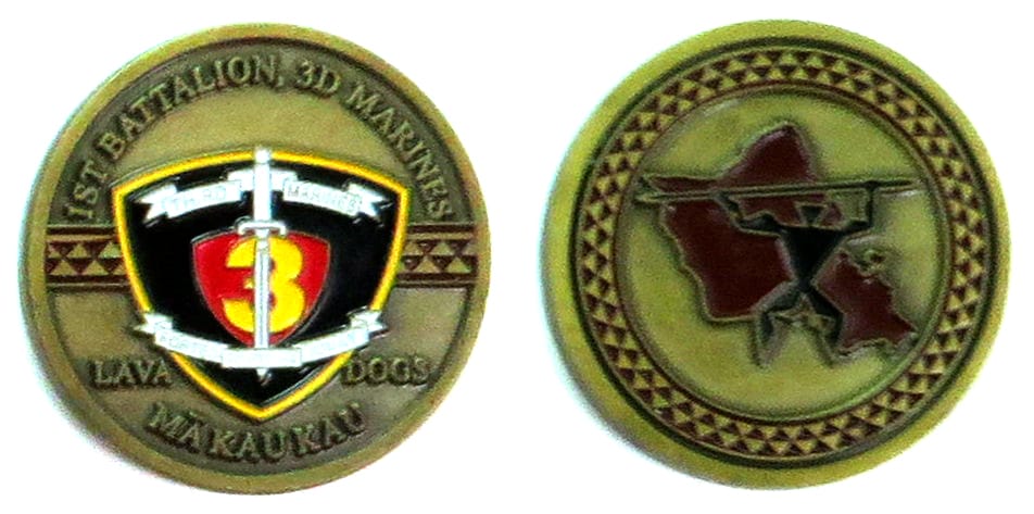 Round shaped coin, antique brass in color, 15/8 inches in diameter 1st Battalion, 3d Marines (1/3) is an infantry battalion in the United States Marine Corps based out of Marine Corps Base Hawaii. Nicknamed the "Lava Dogs", the battalion consists of... Read More
