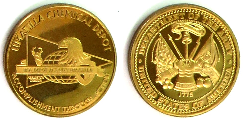 Round shaped coin, gold in color, 1 1/2 inches in diameter. The Umatilla Chemical Depot, (UMCD) based in Umatilla, Oregon, was a U.S. Army installation in the United States that stored chemical weapons and processed them for disposal. The chemical... Read More