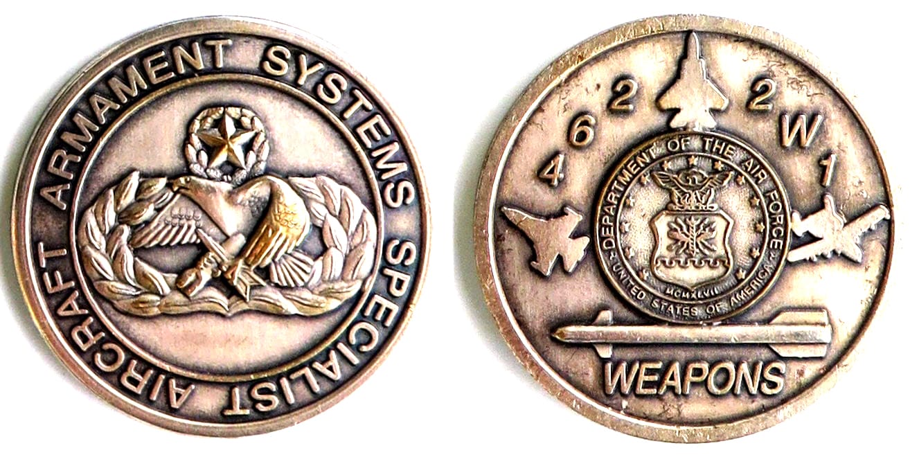 Round shaped coin, pewter in color, 1 5/8 inches in diameter. US Air Force Specialty Code 462 2W1 - Aircraft Armament Systems Specialist Functions: Loads and unloads nuclear and nonnuclear munitions, explosives, and propellant devices on aircraft.... Read More