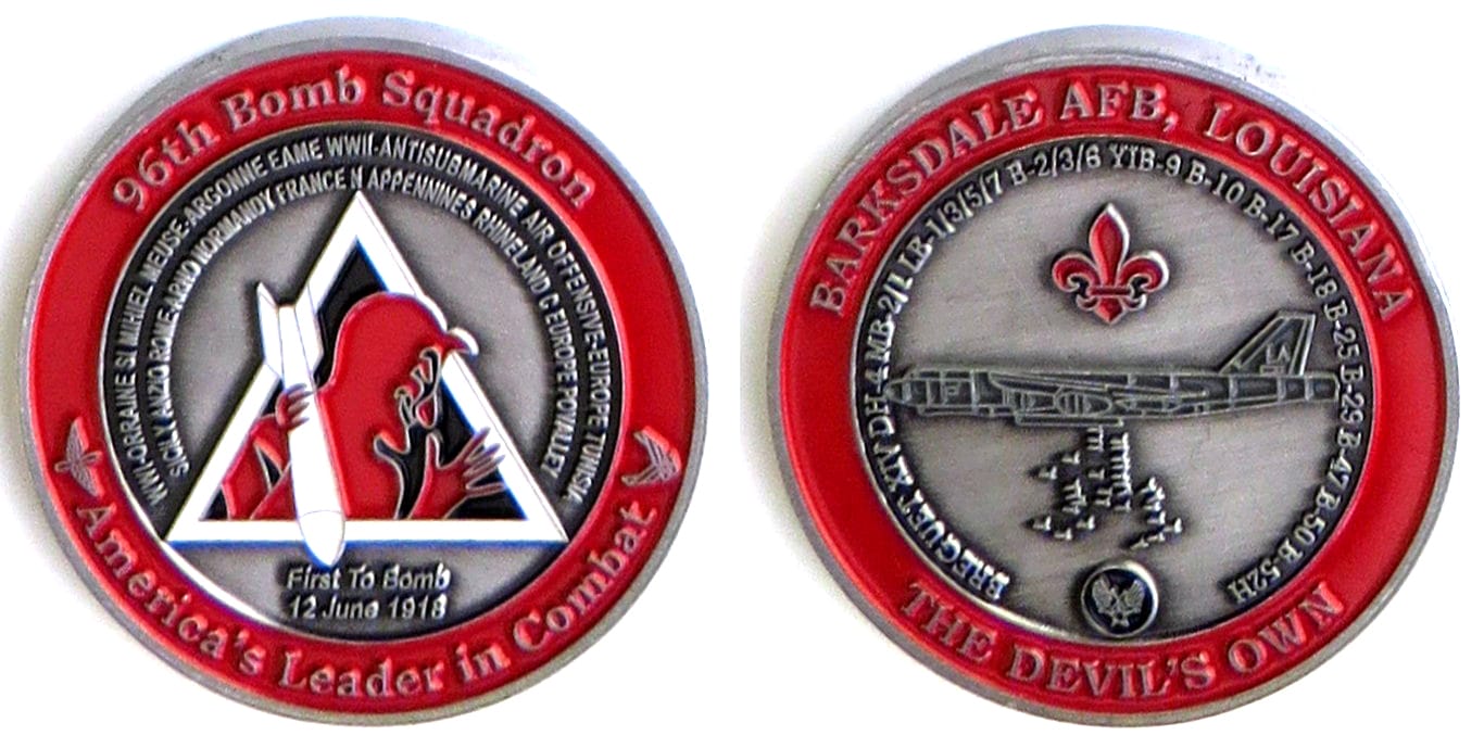 Round shaped coin, pewter in color, 1 3/4 inches in diameter. Since 1993, the 96th Bomb Squadron has flown the B-52H Stratofortress long-range heavy bomber. Read More