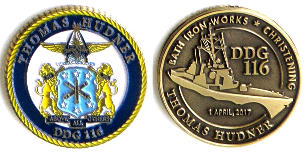 Round shaped coin, antique brass in color, 1 1/2 inches in diameter. The USS THOMAS HUDNER (DDG 116) is the 66th ARLEIGH BURKE-class destroyer and is named in honor of Medal of Honor Recipient CAPT Thomas J. Hudner, Jr., USN (Ret.). Hudner is a Meda... Read More