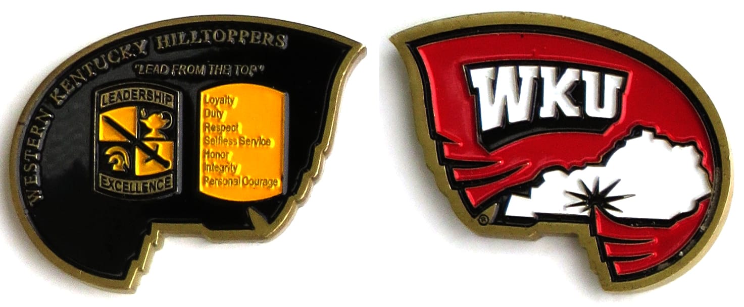 Brass colored coin, 1 1/2 inches high x 2 inches wide. Hilltoppers ROTC, Western Kentucky University ROTC. Read More