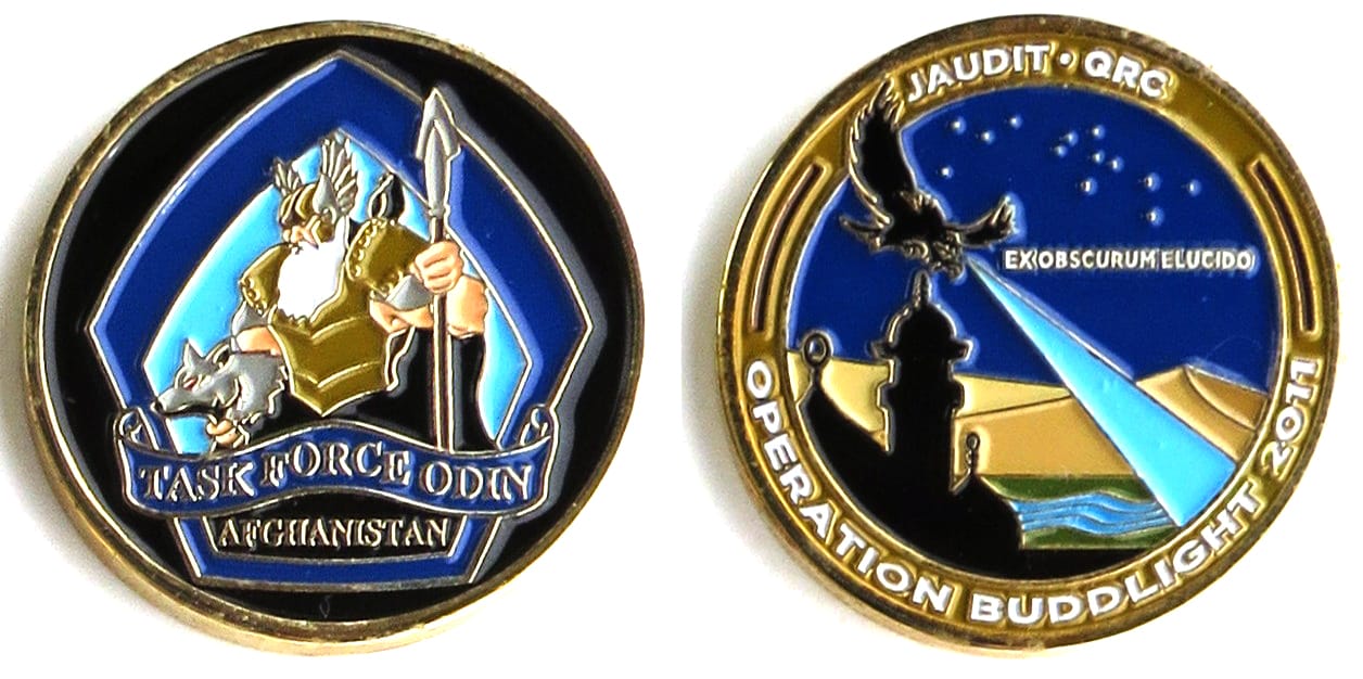 Round shaped coin, brass in color, 1 1//2 inched in diameter. Task Force ODIN, whose name is an acronym for observe, detect, identify, and neutralize, is a United States Army aviation battalion created in August 2006 to conduct reconnaissance, surve... Read More