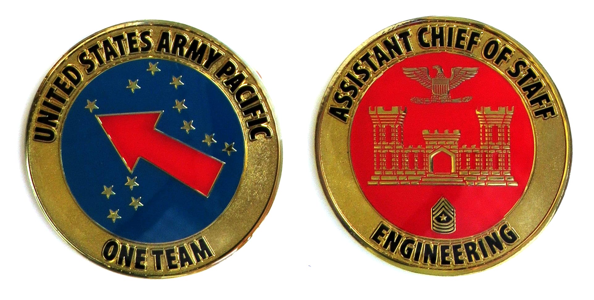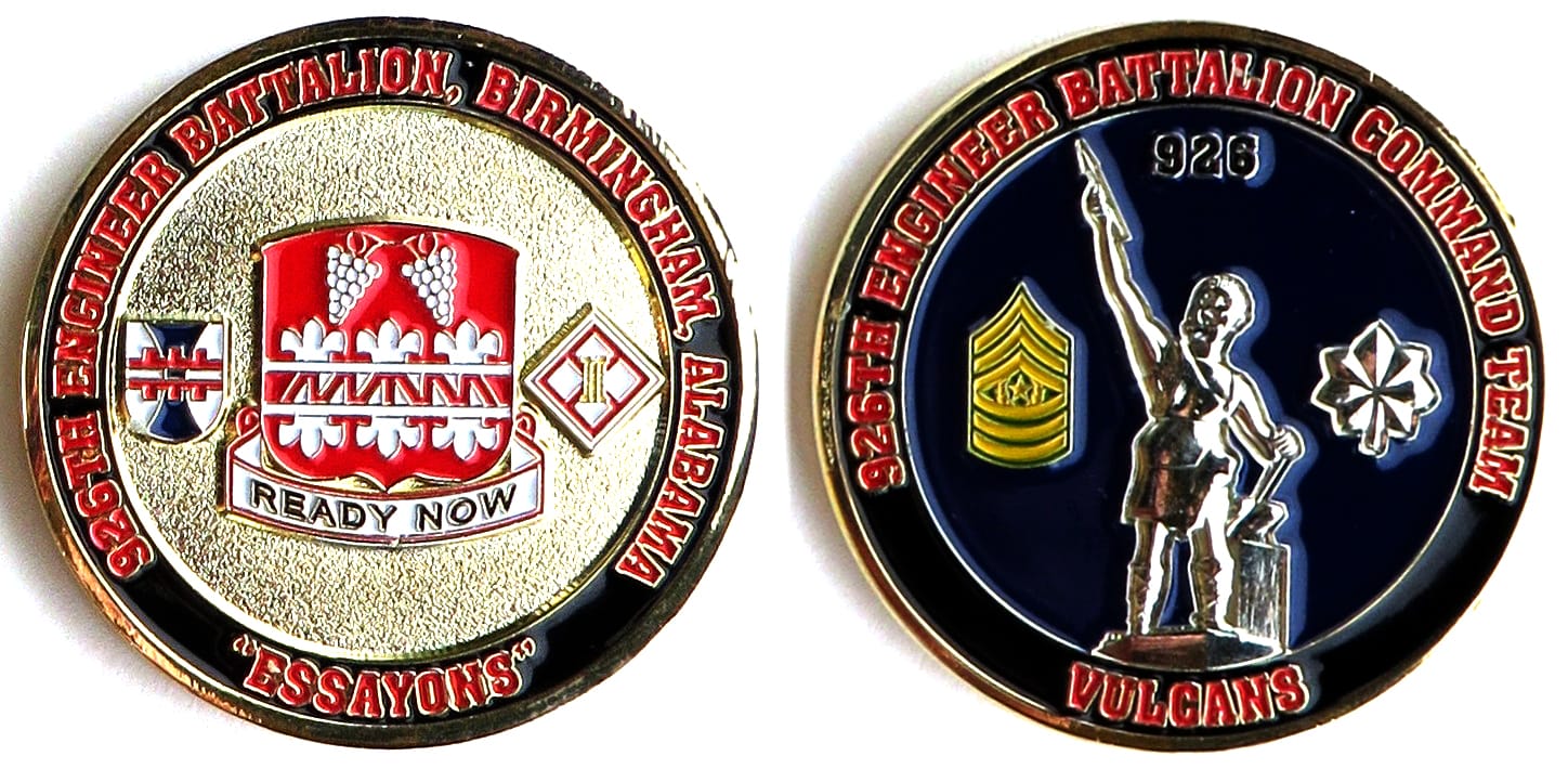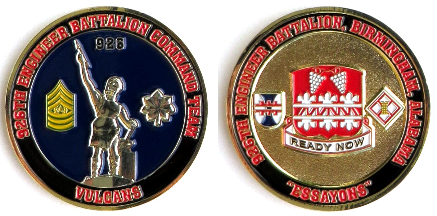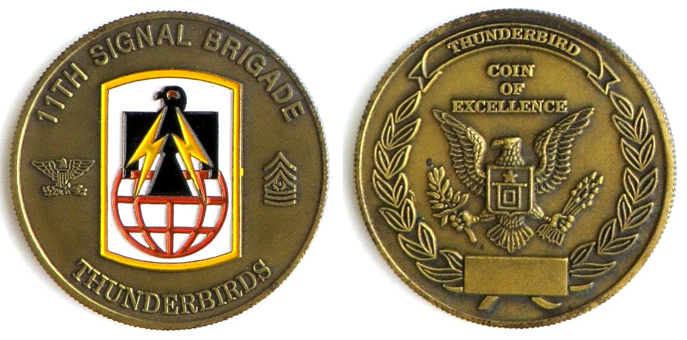 Round shaped coin, antique brass in color, 2 1/4 inches in diameter. 1st Battalion, 43rd Air Defense Artillery Regiment, 11th Air Defense Artillery Brigade. Read More