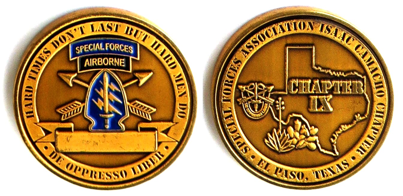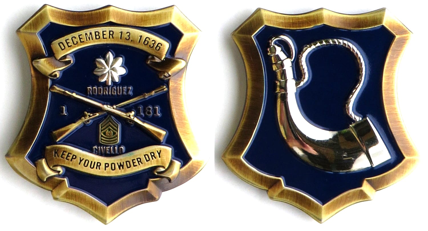 Shield shaped coin, brass in color, 2 inches high x 1 7/8 inches wide. The 181st Infantry Regiment shares the distinction of being the oldest combat regiment in the United States Army. The regiment traces its history to 13 December 1636, when it was... Read More
