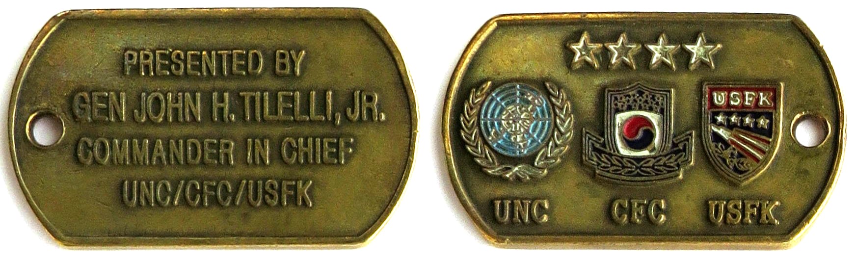Dog tag shaped coin antique brass in color, 1 1/4 inches high x 2 1/4 inches wide. Read More