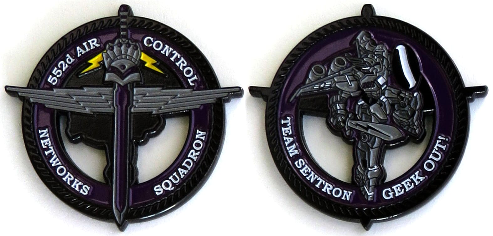 Round based coin with sword and stylized wings protruding, Gunmetal black in color, 1 7/8 inches high x 2 inches wide. Read More