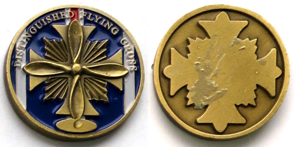 Round shaped coin, antique brass in color, 1 1/2 inches in diameter. The Distinguished Flying Cross is a military decoration awarded to any officer or enlisted member of the United States Armed Forces who distinguishes himself or herself in support... Read More