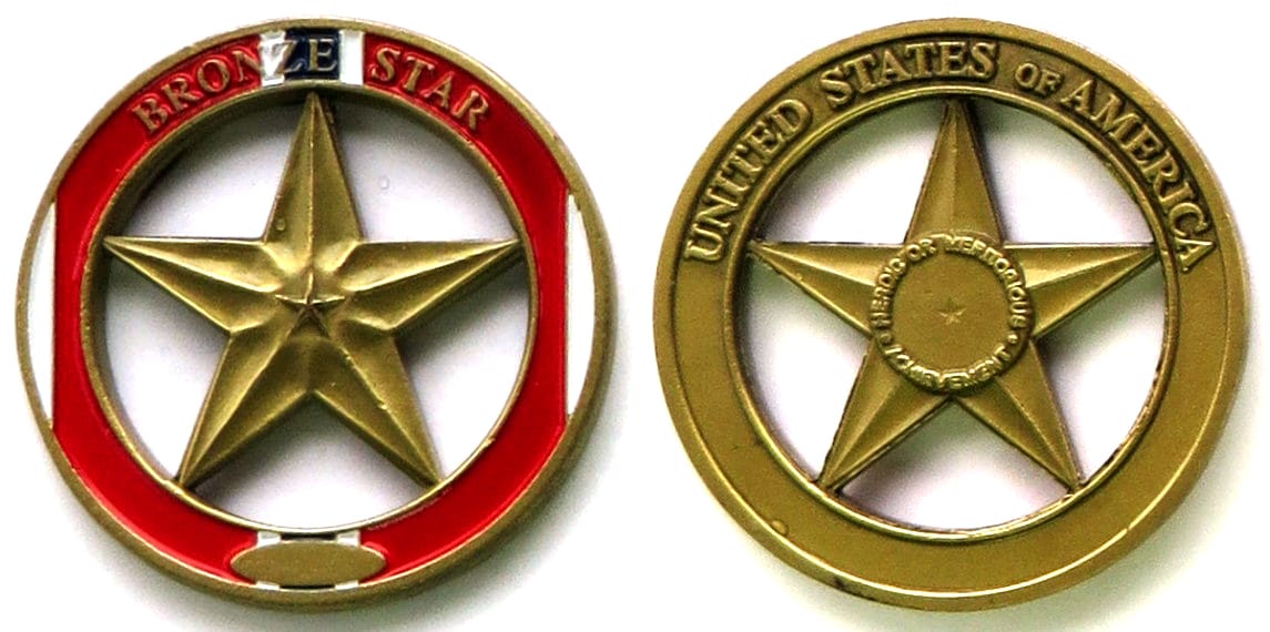 Round shaped coin, Antique brass in color, 1 3/4 inches in diameter. The Bronze Star Medal, unofficially the Bronze Star, is a United States decoration awarded to members of the United States Armed Forces for either heroic achievement, heroic servic... Read More