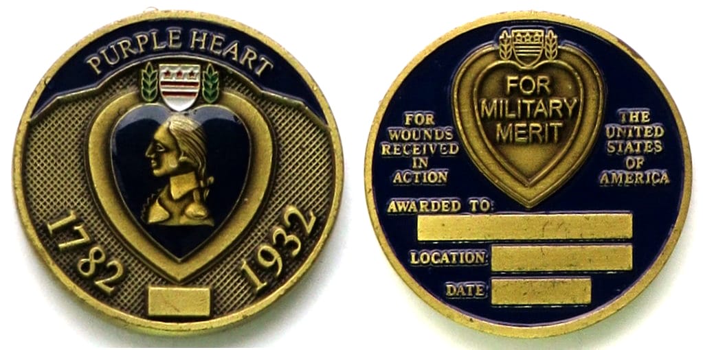Round shaped coin, antique brass in color, 1 1/2 inches in diameter. The Purple Heart is a United States military decoration awarded in the name of the President to those wounded or killed while serving, on or after April 5, 1917, with the U.S. mili... Read More