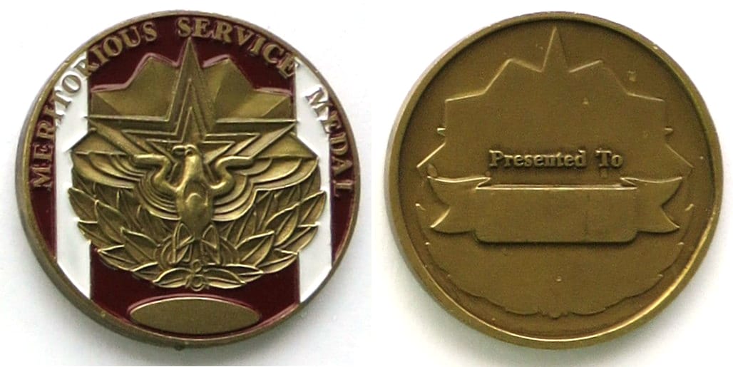 Round shaped coi antique brass in color, 1 1/2 inches in diameter. The Meritorious Service Medal (MSM) is a military award presented to members of the United States Armed Forces who distinguished themselves by outstanding meritorious achievement or... Read More