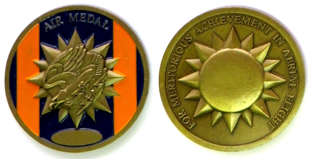 Round shaped coin, antique brass in color, 1 1/2 inches in diameter. The Air Medal is a military decoration of the United States military. The medal was created in 1942 and is awarded for single acts of heroism or meritorious achievement while parti... Read More