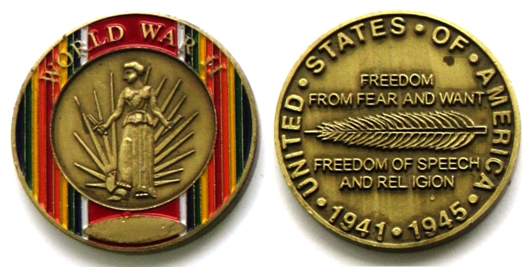 Round shaped coin, antique brass in color, 1 1/2 inches in diameter. The World War II Victory Medal is a service medal of the United States military which was established by an Act of Congress on 6 July 1945. The World War II Victory Medal was first... Read More