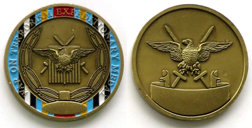 Round shaped coin, antique brass in color, 1 5/8 inches in diameter. The Global War on Terrorism Expeditionary Medal (GWOT-EM) is a United States Armed Forces award created by George W. Bush on 12 March 2003. The medal recognizes those military serv... Read More