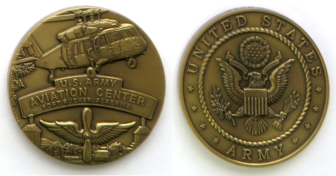 Round shaped coin, antique brass in color, 1 3/4 inches in diameter. The U.S. Army Aviation Center and School, is the United States Army Aviation Branch's training and development center, located at Fort Rucker, Alabama. It "trains military, civil... Read More