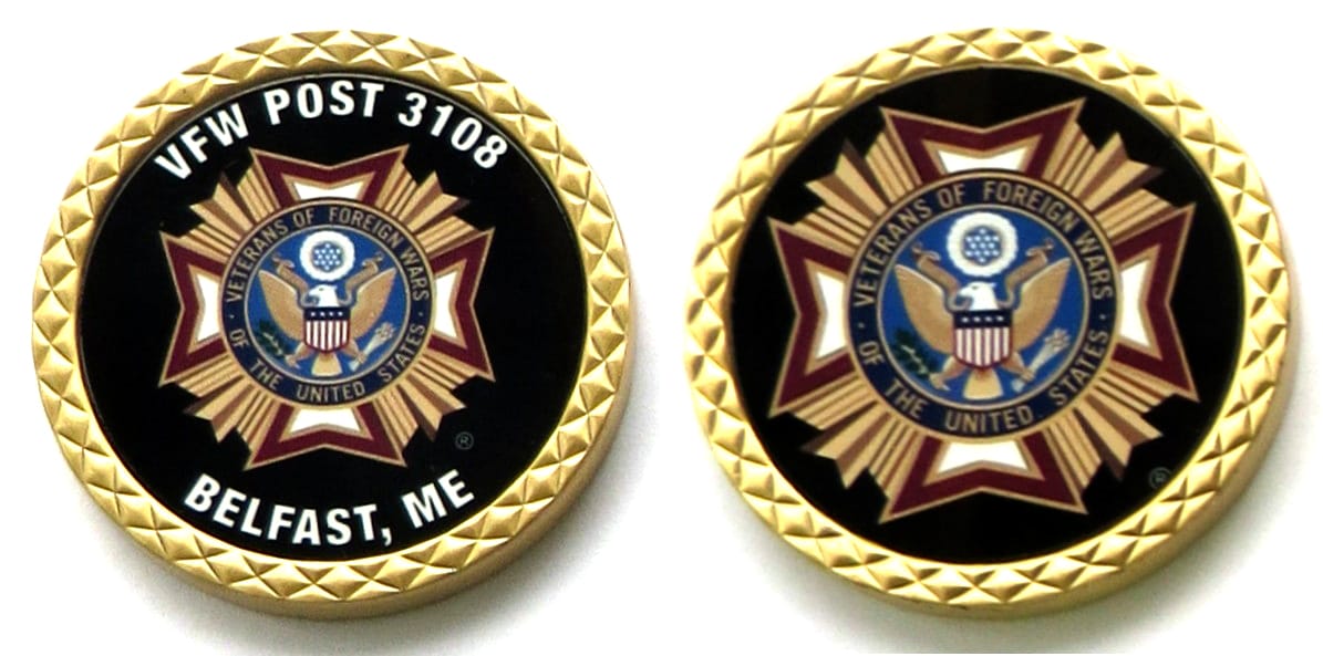 Round shaped coin, brass in color, 1 3/4 inches in diameter. VFW Post 3108, Belfast Maine. Read More