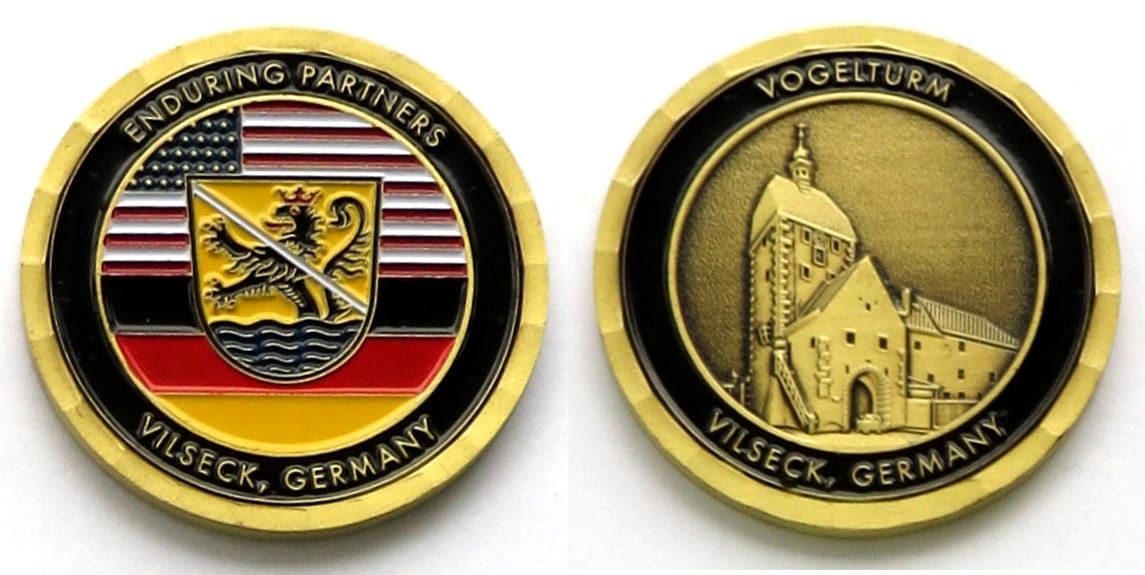 Round shaped coin brass in color, 1 3/4 inches in diameter. Vilseck, Germany. Vilseck is a town in northeastern Bavaria, Germany, situated on the river Vils, a tributary of the Naab river. The town is geographically separate from a nearby large... Read More
