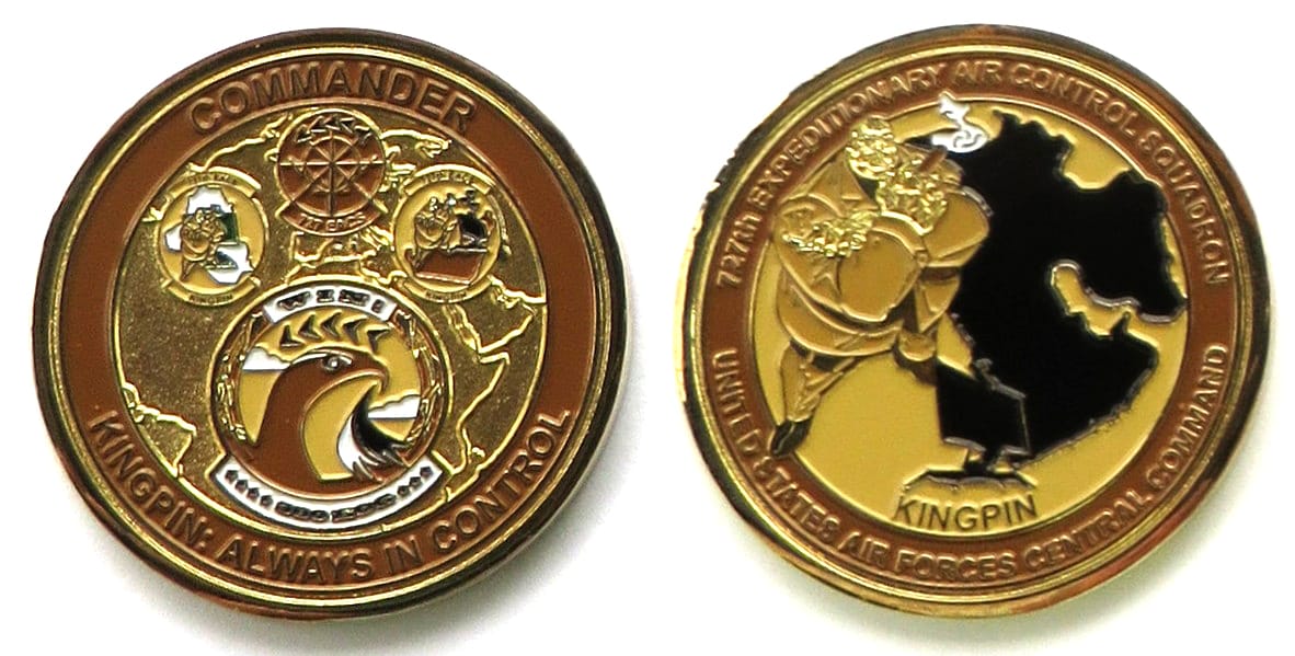 Round shaped coin, brass in color, 1 3/4 inches in diameter. 727th Expeditionary Air Control Squadron. Read More