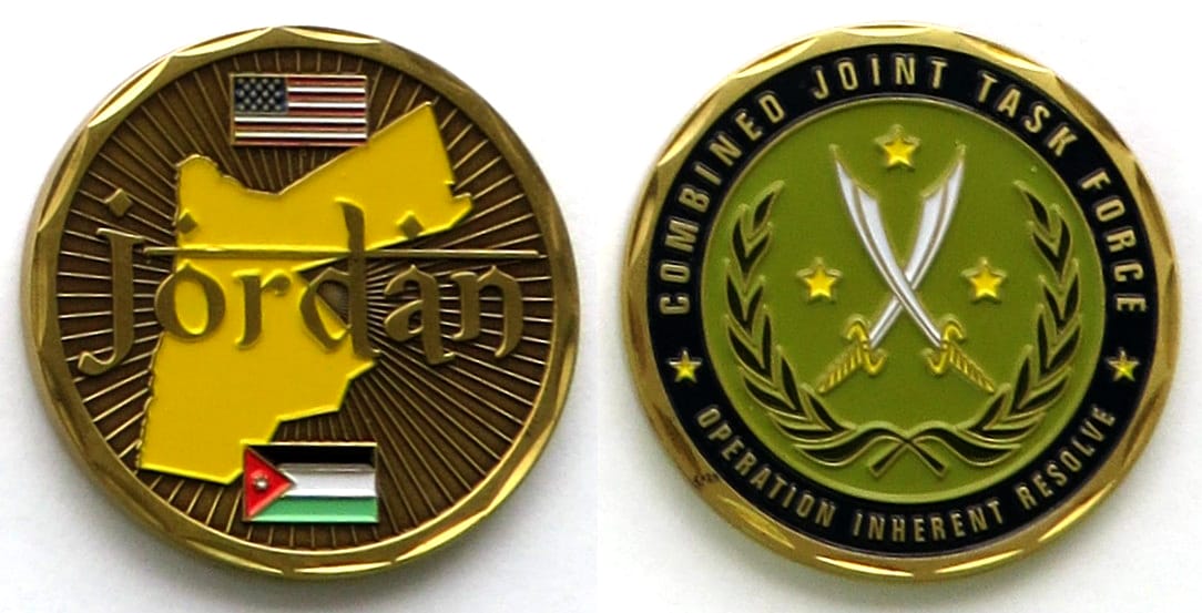 Round shaped coin, brass in color, 1 5/8 inches in diameter. Combined Joint Task Force, Jordan. Read More