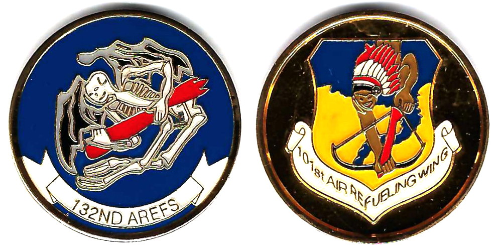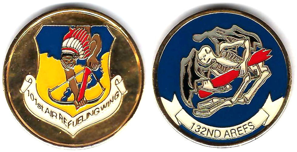 Round shaped coin, brass in color, 1 5/8 inches in diameter. 132nd Air Refueling Squadron, 101st Air Refueling Wing, Maine air National Guard. Read More