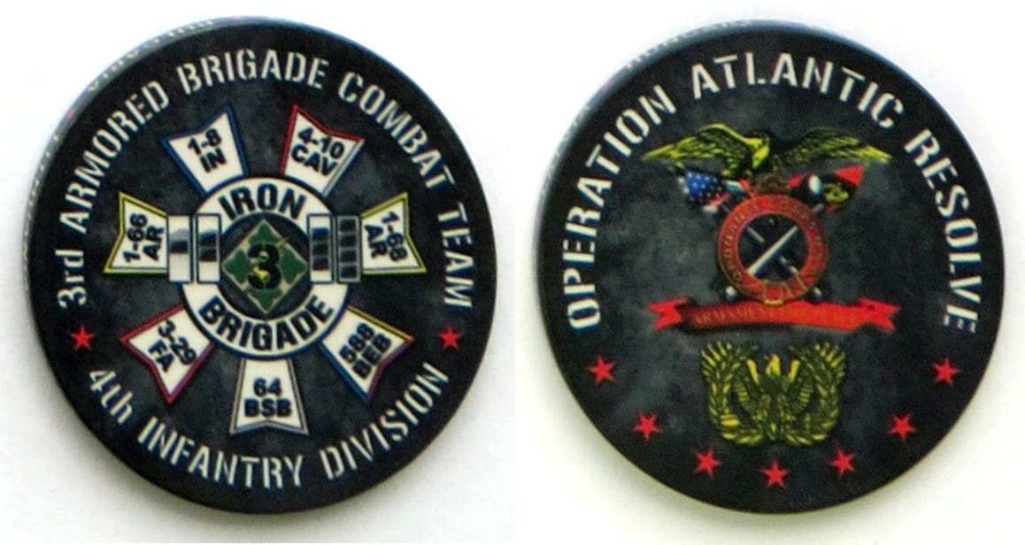 Round shaped poker chip, gray in color, 1 5/8 inches in diameter. 3rd Armored Brigade Combat Team, 4th Infantry Division. Read More