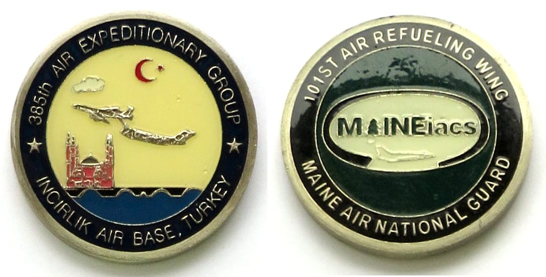 Round shaped coin, pewter in color, 1 5/8 inches in diameter. 385th Air Expeditionary Group, 101st Air Refueling Wing, Maine Air National Guard. Read More