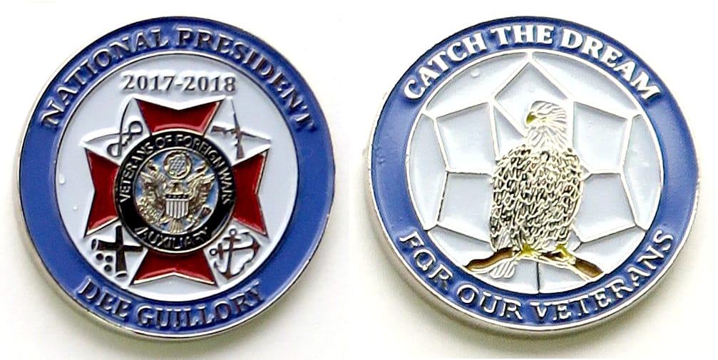 Round shaped coin, pewter in color, 1 5/8 inches in diameter. Dee Guillory, VFW Auxiliary National President, 2017-2018. Read More